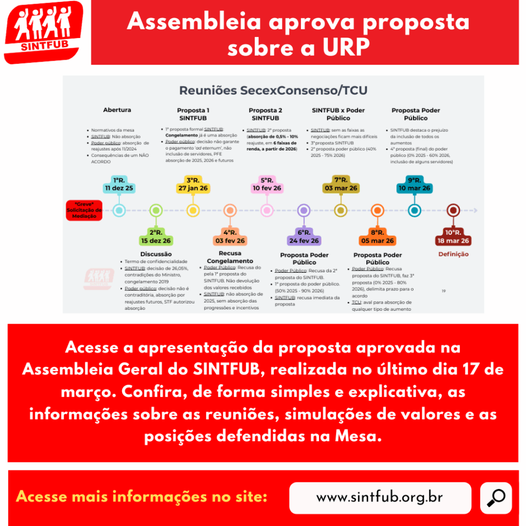 A assembleia geral extraordinária realizada no dia 17 de março debateu e aprovou a proposta final apresentada pelo MGI na Mesa de mediação no Tribunal de Contas da União (TCU) sobre a URP da categoria técnico-administrativa em educação da Universidade de Brasília (UnB). O processo de negociação envolveu o SINTFUB, a UnB, o Ministério da
