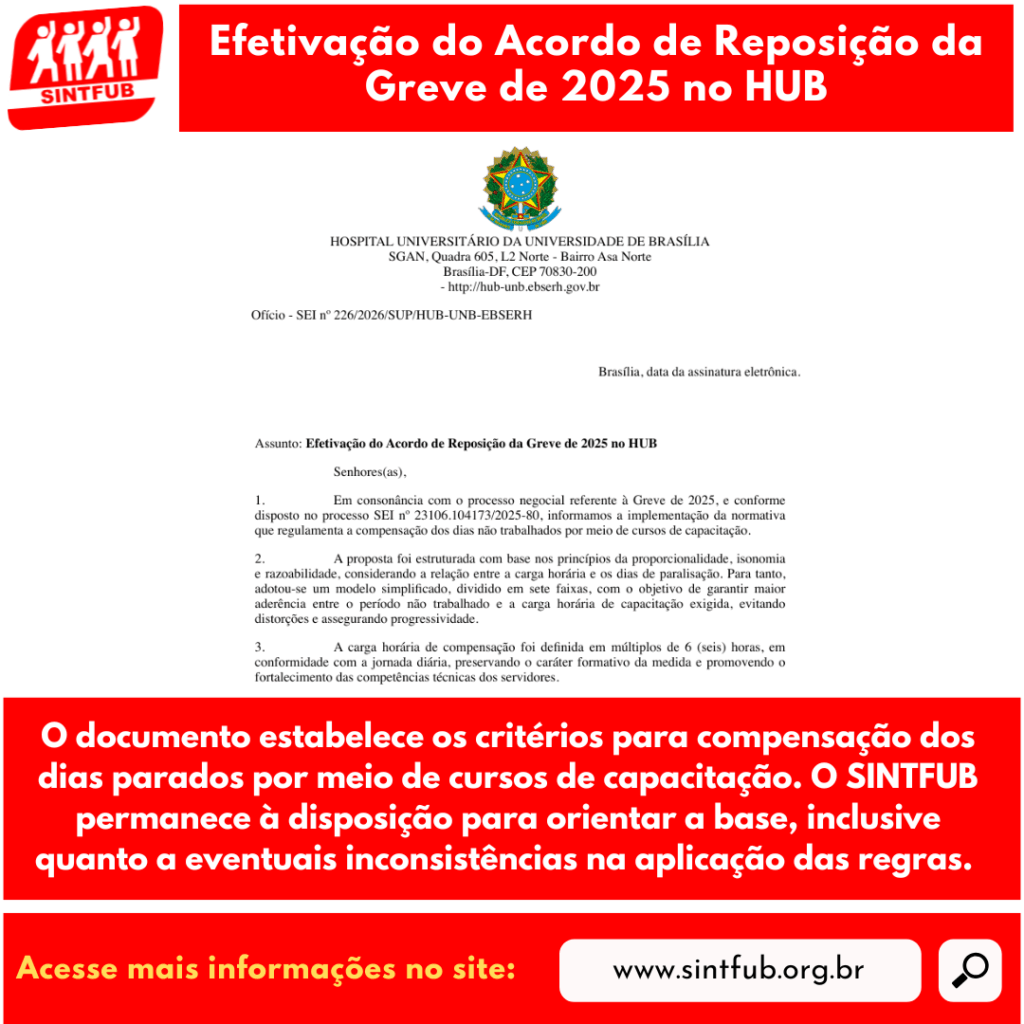 Foi publicado pelo Hospital Universitário de Brasília (HUB) o Ofício SEI nº 226/2026 com orientações para a efetivação do acordo de reposição da greve de 2025. O documento estabelece os critérios para compensação dos dias parados por meio de cursos de capacitação, medida que impacta diretamente as servidoras e os servidores técnico-administrativos em educação. De