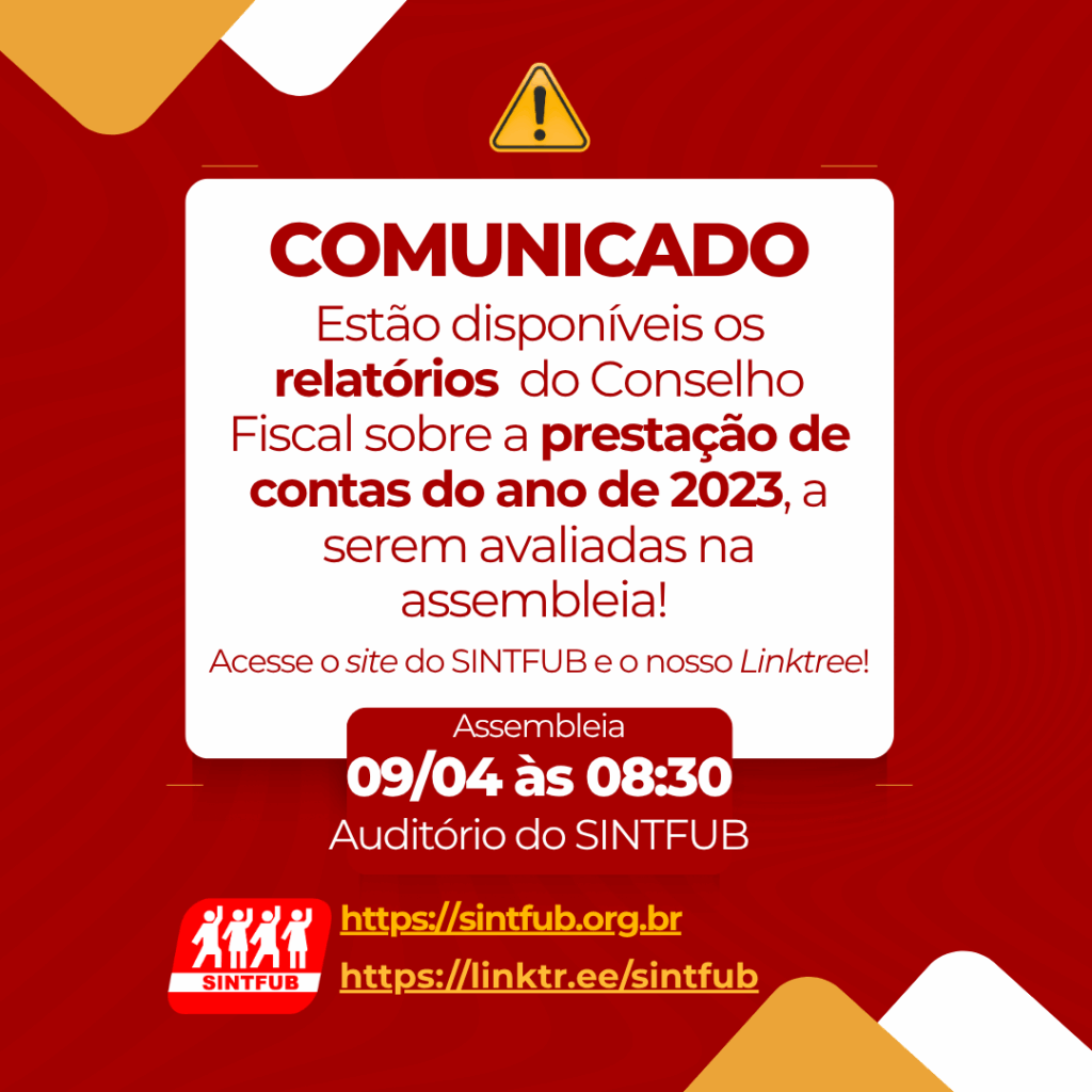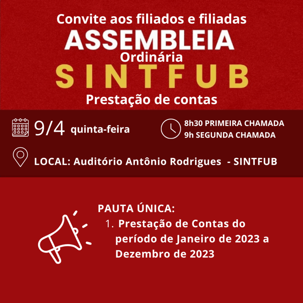 O Sindicato dos Servidores Técnico-Administrativos da Fundação Universidade de Brasília (SINTFUB) publicou edital convocando suas filiadas e seus filiados para participarem da Assembleia Geral Ordinária de Prestação de Contas referente ao exercício de 2023. A atividade será realizada no dia 9 de abril de 2026 (quinta-feira), com início às 8h30, em primeira convocação, quando será