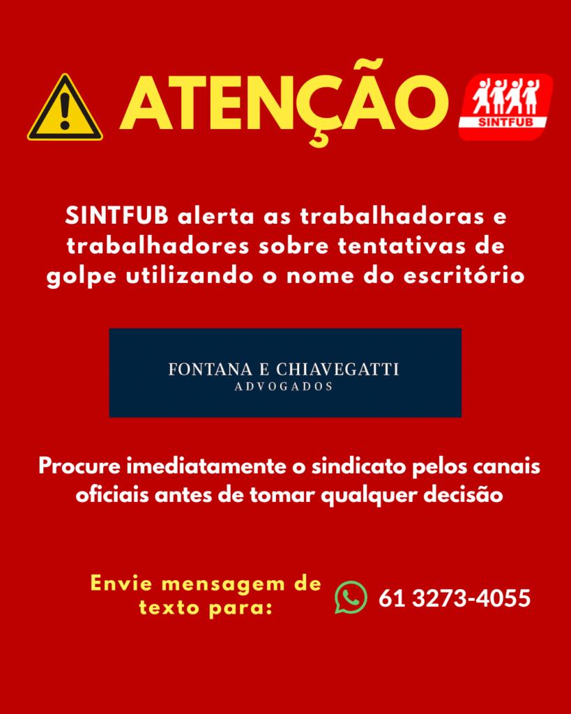 Estelionatários utilizam informações reais de processos O SINTFUB alerta as trabalhadoras e os trabalhadores técnico-administrativos em educação da Universidade de Brasília sobre uma tentativa de golpe que tem utilizado indevidamente o nome do escritório Fontana e Chiavegatti Advogados, responsável pela assessoria jurídica cível do sindicato. De acordo com relatos recebidos, estelionatários estão entrando em contato
