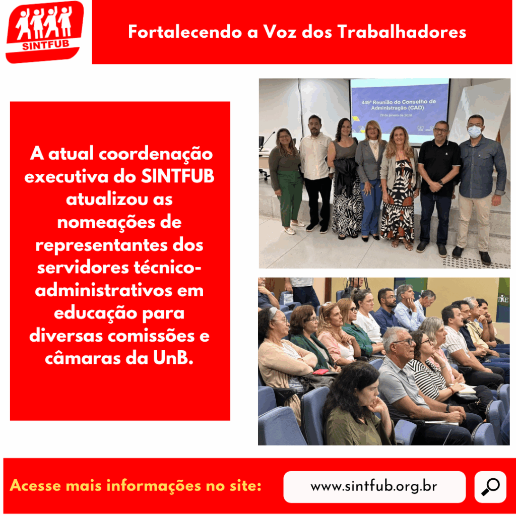 Nomeações de Representantes do SINTFUB nos Conselhos e Câmaras da UnB Além da posse e início das atividades dos membros eleitos para os conselhos superiores da Universidade de Brasília (UnB), como o Conselho Universitário (Consuni) — órgão colegiado máximo responsável pela formulação de políticas globais, aprovação da programação anual de trabalho e avaliação do desempenho
