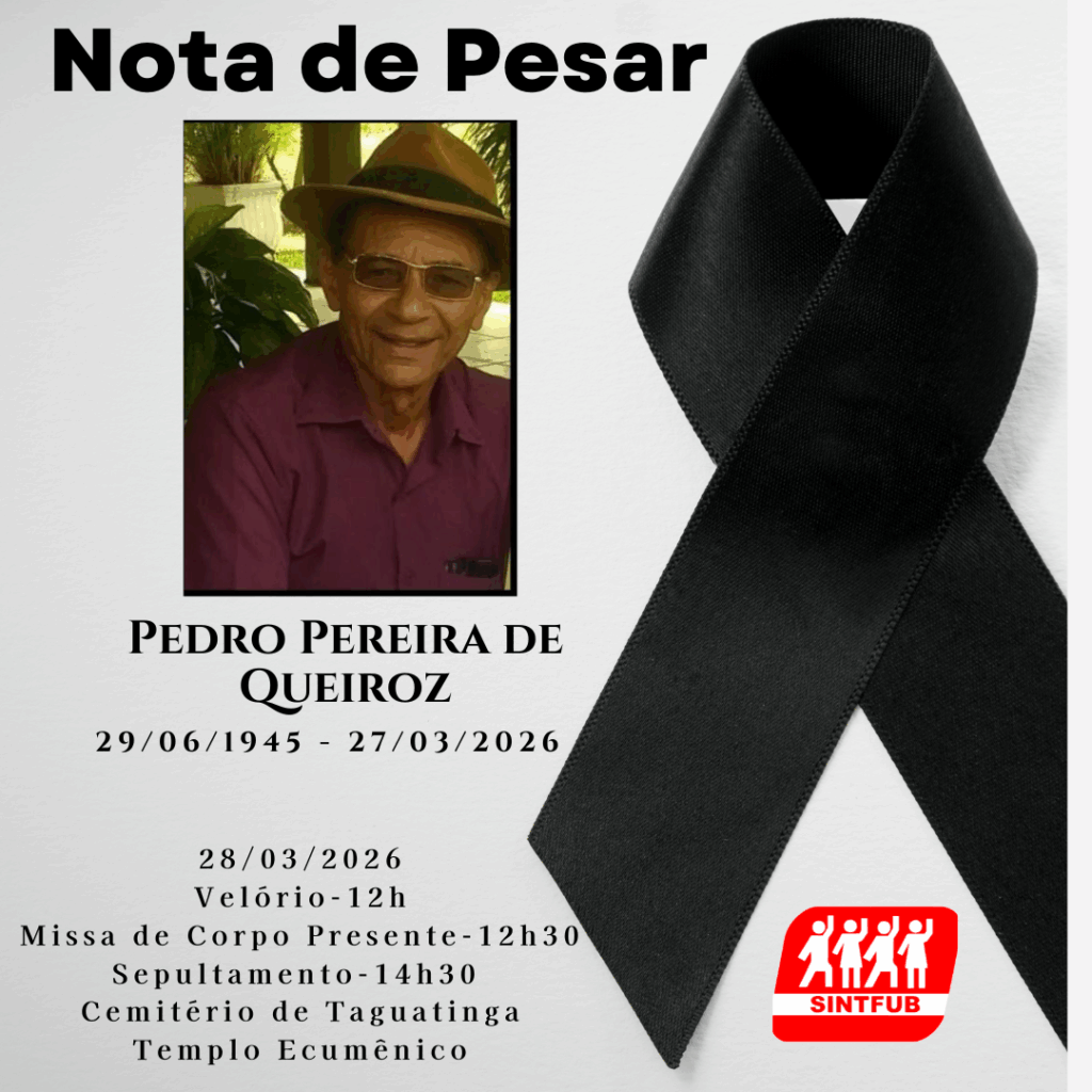 Com pesar, comunicamos o falecimento do servidor técnico-administrativo em educação Pedro Pereira de Queiroz. Seu Pedro, como ficou conhecido no campus Darcy Ribeiro, estava aposentado. Trabalhou Prefeitura e era muito querido pelos amigos. Na hora do almoço, a partida de dama ou pescaria no Lago era certa. Sempre prestativo, atencioso. Neste momento de dor, ficamos