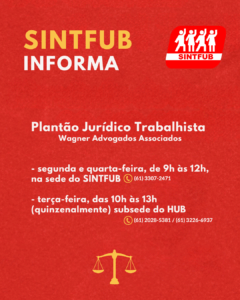 O servidor e a servidora associados ao SINTFUB têm direito a atendimento jurídico gratuito com os advogados contratados pelo Sindicato. Além de atendimento para questões trabalhistas, casos como família, inventário, alimentos e outros nas áreas cível e criminal de menor poder ofensivo podem ser resolvidos com a equipe de advogados em alguns locais e dias específicos.