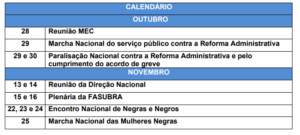 O Informe 27 ainda trata do Encontro Nacional de Aposentadas(os), Aposentandas(os) realizado nos dias 15 a 17/10; faz a convocação para a Marcha Nacional dos Serviços públicos do dia 29/10; e de uma Plenária Nacional da categoria nos dias 15 e 16 de novembro, em Brasília.