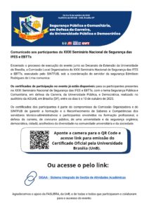Os certificados dos participantes é parte do compromisso da Comissão Organizadora e do SINTFUB de garantir a formação e o Reconhecimento de Saberes e Competências dos servidores técnico-administrativos e participantes envolvidos na formação profissional, e defesa da carreira, de concurso público, de uma universidade e da segurança orgânica, democrática, cidadã, acolhedora da diversidade na comunidade universitária e da sociedade.