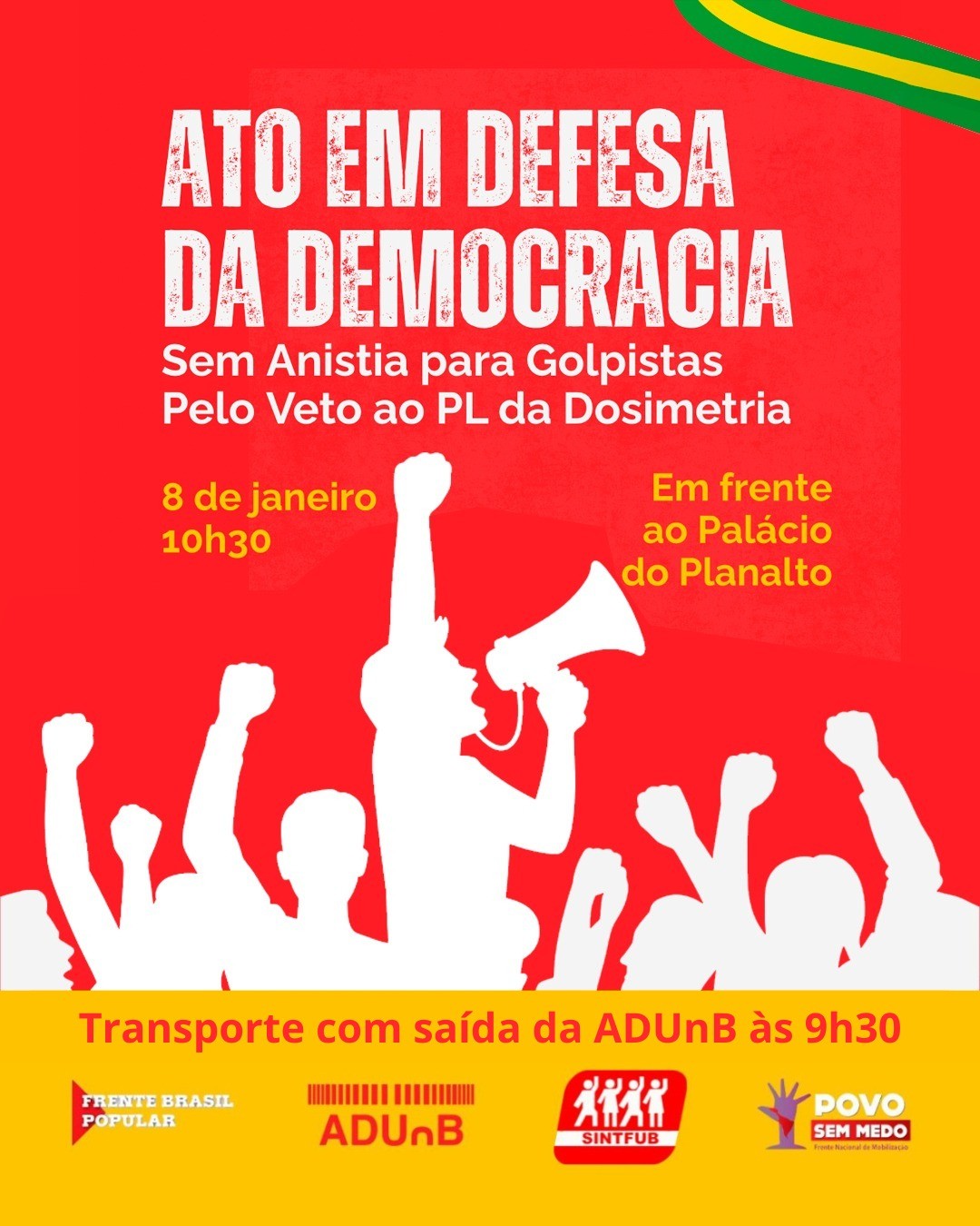 No dia 8 de janeiro serão realizados atos por todo o Brasil em defesa da democracia. Em Brasília, a Central Única dos Trabalhadores (CUT), seus sindicatos filiados, juntamente com movimentos sociais, organizações poíticas, e outras centrais, estão convocando um ato na Praça dos Três Poderes, em frente ao Palácio do Planalto, com o lema “em defesa da democracia, sem anistia para golpistas, pelo veto ao PL da dosimetria”.