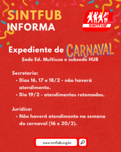 Confira como fica o expediente de Carnaval no SINTFUB