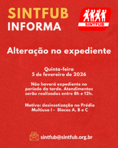 O SINTFUB informa que, devido à desinsetização no Prédio Multiuso I, Blocos A, B e C, não haverá expediente na sede do sindicato na tarde desta quinta-feira, 5 de fevereiro de 2026. O funcionamento na sede do sindicato será das 8h às 12h.