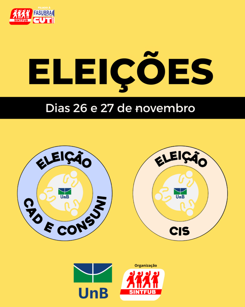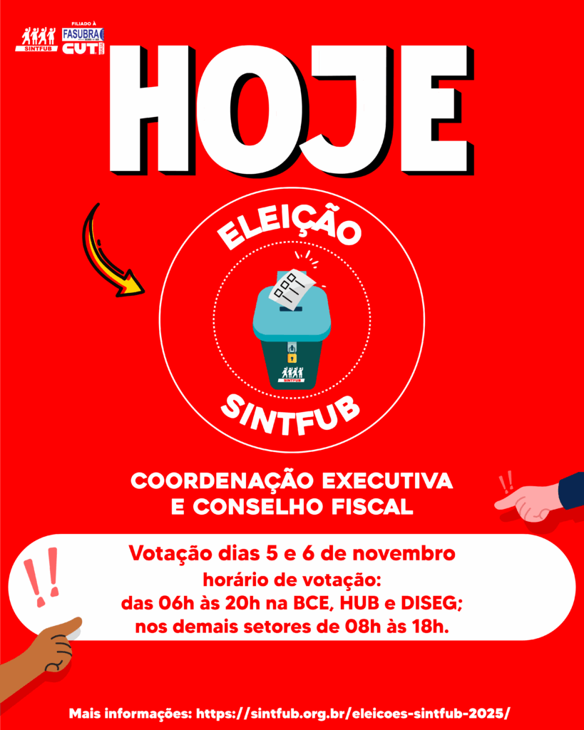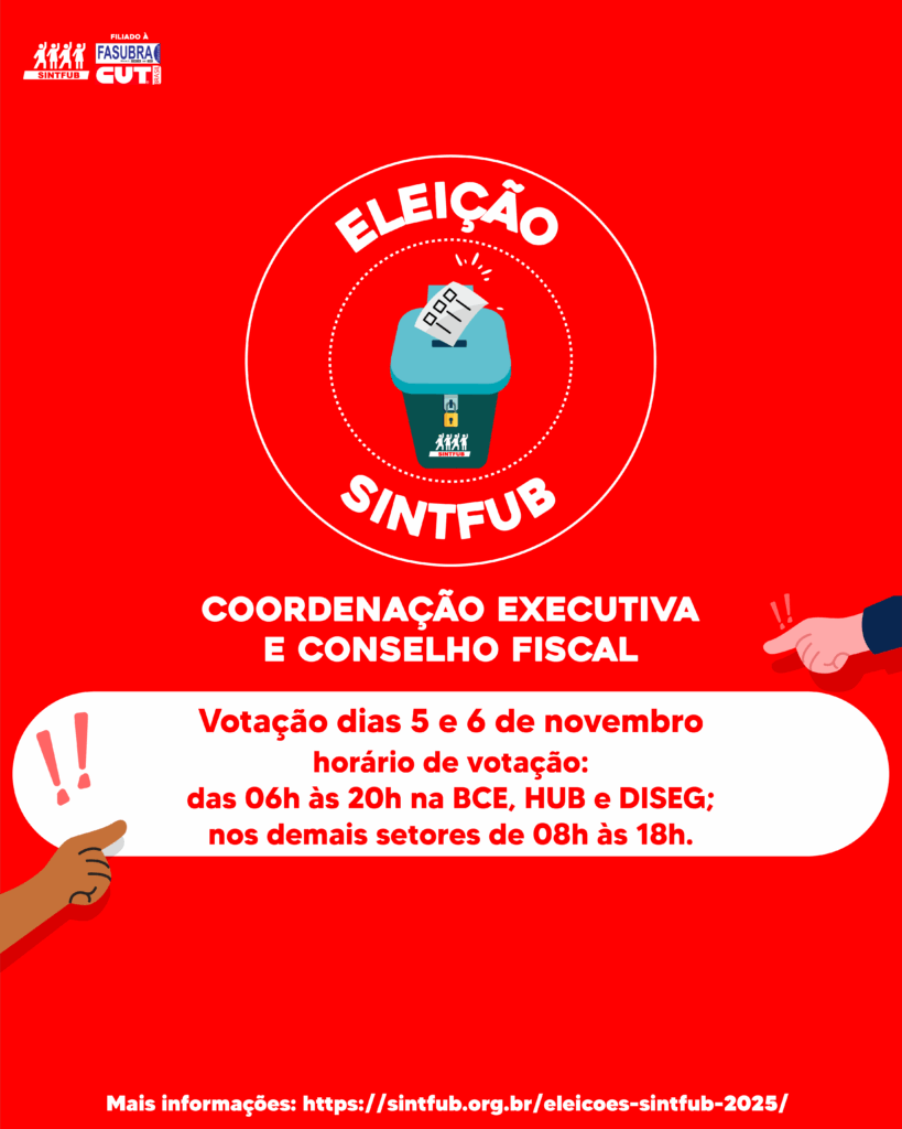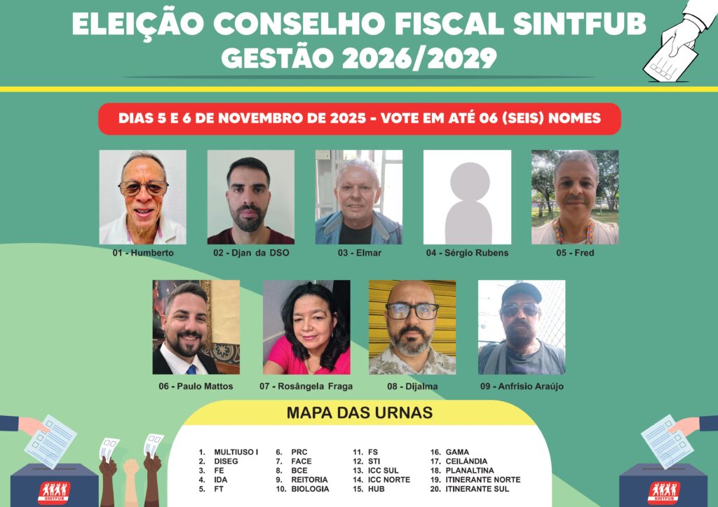 É hora de decidir os rumos do SINTFUB: Participe das eleições 2025! Nos dias 5 e 6 de novembro, será realizada a votação para a escolha da Coordenação Executiva e do Conselho Fiscal do SINTFUB. Est...
