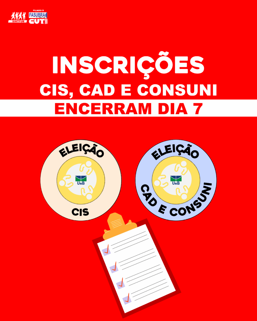 A Comissão Eleitoral das Eleições 2025 do SINTFUB alerta para o prazo de inscrição nas eleições para representantes de servidoras e servidores técnico-administrativos da UnB para CIS (Comissã...