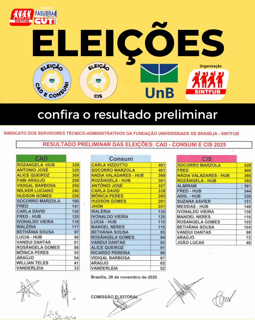 Chapa 1 foi eleita para a Coordenação Executiva do SINTFUB, Gestão 2026-2029 Na noite desta sexta-feira, 7, foi encerrada a apuração dos votos para a Coordenação Executiva e Conselho Fiscal do SINT...