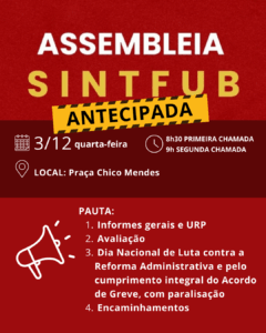 O SINTFUB convoca todas as servidoras e servidores técnico-administrativos da UnB: dia 4 de dezembro, às 10h, no CAD. É fundamental a presença de todos para juntos fortalecer a resistência contra a reforma administrativa e lutar pelo cumprimento dos direitos conquistados na greve de 2024.