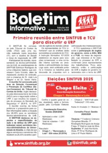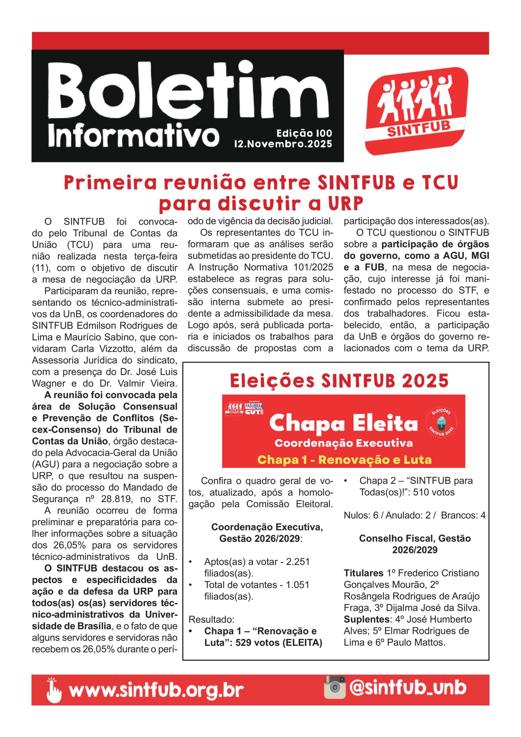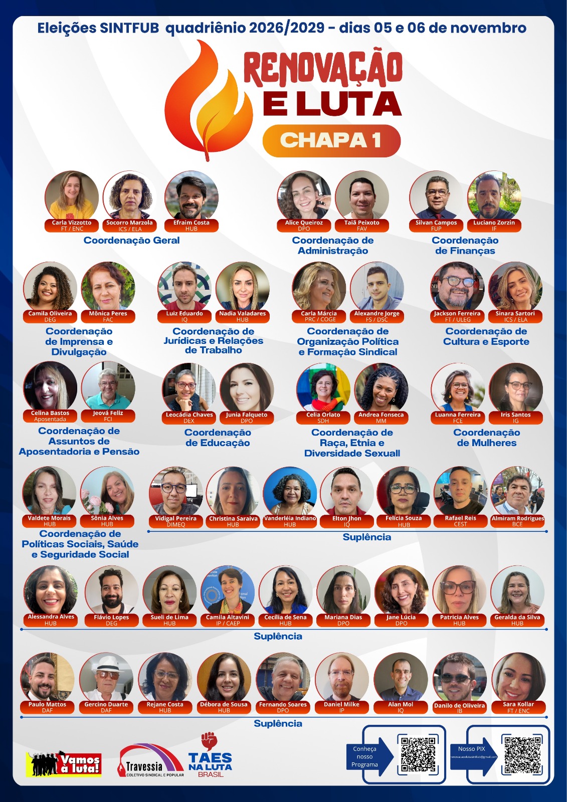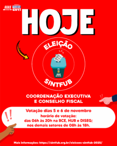 Hoje (5) inicia a votação da eleição para a Coordenação Geral e o Conselho Fiscal da gestão 2026/2029. Amanhã (6) segue o recolhimento dos votos dos sindicalizados do SINTFUB, com apuração prevista para a sexta-feira, dia 7/11.