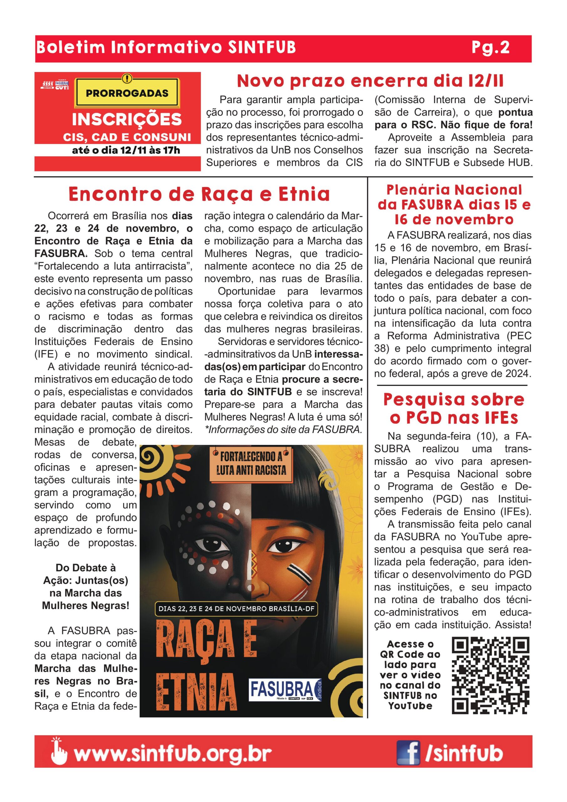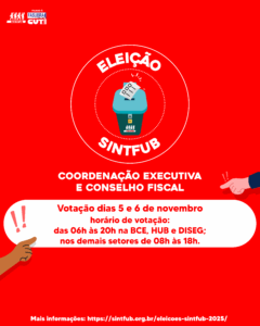 A eleição do SINTFUB será realizada nos dias 5 e 6 de novembro, e todas e todos os sindicalizados estão convidados a participar desse importante momento democrático para o futuro da entidade.