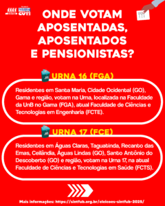 Os Técnicos e Técnicas sindicalizados votam em seu local de trabalho conforme tabela acima, e aposentdas(os) e pensionistas votam na urna mais próxima da sua residência.
