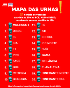 Sendo que as urnas do HUB, BCE e DISEG funcionam das 6h às 20h, enquanto todas as demais estarão abertas para votação das 8h às 18h.