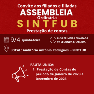 A assembleia será realizada no Auditório Antônio Rodrigues, na sede do SINTFUB, com primeira chamada às 8h30 e segunda chamada às 9h.