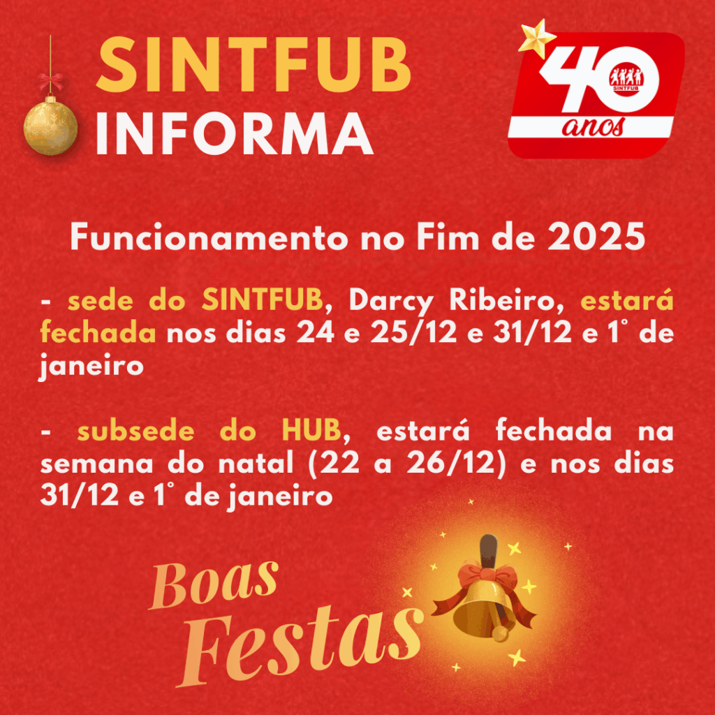 Em razão das festas de fim de ano, o SINTFUB informa que haverá alterações no funcionamento de suas unidades no período final de 2025 e início de 2026. A sede do SINTFUB, no campus Darcy Ribeiro, estará fechada nos dias 24 e 25 de dezembro de 2025, em função do Natal, e nos dias 31
