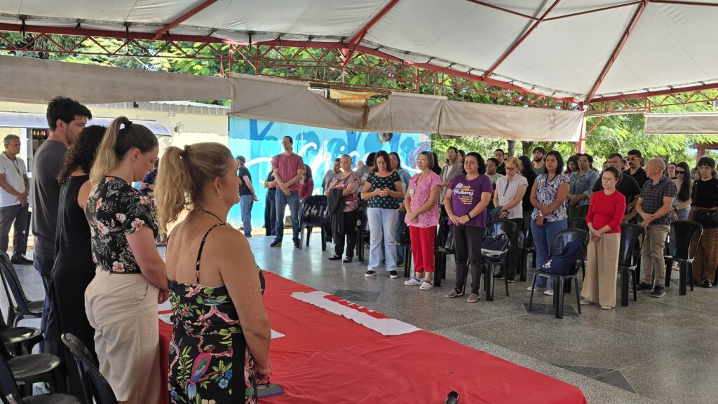 A Assembleia Geral Extraordinária do SINTFUB ocorreu na quarta-feira (12/2), reunindo servidoras e servidores técnico-administrativos da UnB, da ativa e aposentados(as), para homenagens, informes e debates sobre pautas importantes da categoria. A mesa da assembleia foi composta por representantes da Coordenação Geral, Carla Vizzotto, Maria do Socorro Marzola e Efraim Costa, da Coordenação de Administração,