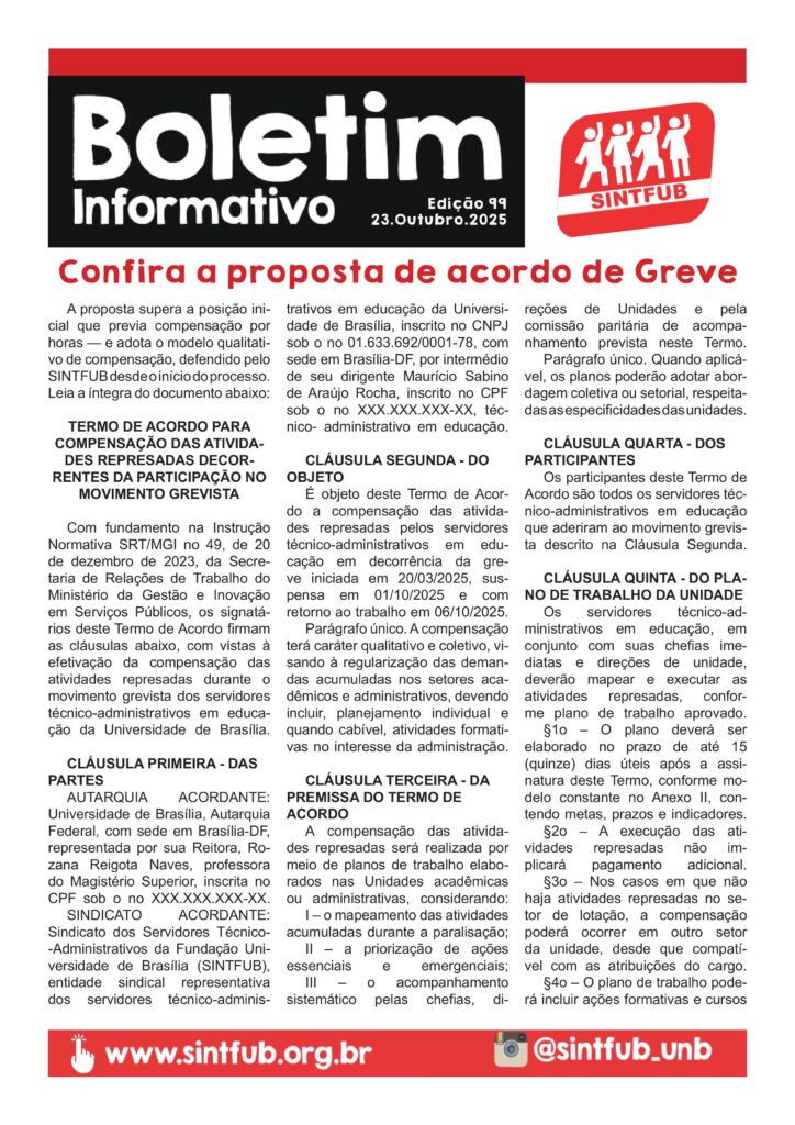 Está disponível o Boletim Informativo 99, de 23 de Outubro de 2025, que traz como pauta: 1. SINTFUB negocia acordo de encerramento da greve (pág. 1 e 2) 2. Marcha Nacional em Defesa dos Serviços Públicos, dia 29/10 (pág. 2) Download Clique aqui e acesse o Boletim Informativo 99, de 23/10/2025 (formato PDF). Clique aqui e acesse a