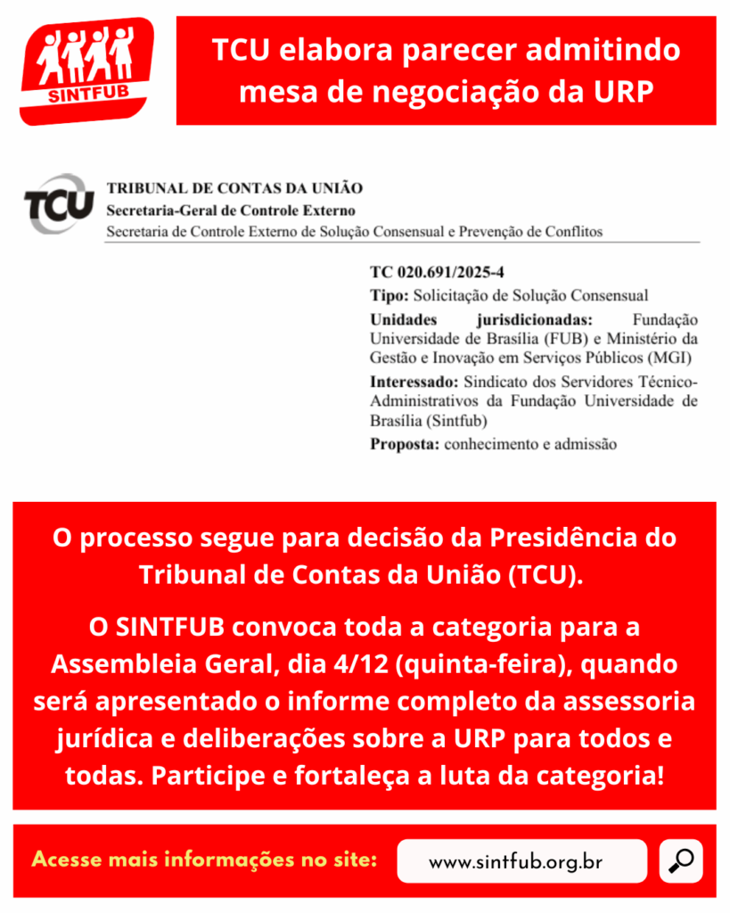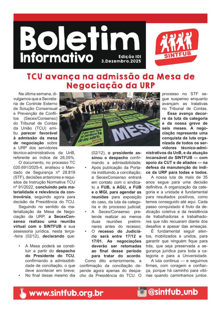 Leia aqui o informe com infomrações sobre o despacho confirmando a conciliação no TCU Acesse o Boletim Infomrativo 101, de 03 de Dezembro de 2025, que traz como pauta: 1. TCU avança na admissão da Mesa de Negociação da URP (pág. 1) 2. Festa Confraternização 2025, nos 40 anos do SINTFUB! (pág. 2) 3. Luta contra a
