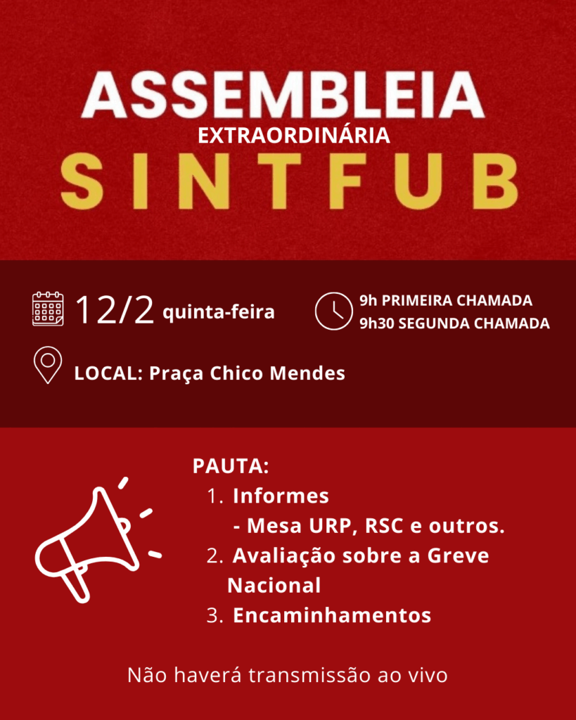 A Coordenação Executiva do Sindicato das Servidoras e Servidores Técnico-Administrativos da Fundação Universidade de Brasília (SINTFUB) convoca a todos para a Assembleia Geral Extraordinária, a ser realizada na quinta-feira, 12/2, com primeira chamada às 9h, na Praça Chico Mendes, campus Darcy Ribeiro. Pauta: Informes (Mesa URP, Reconhecimento de Saberes e Competências – RSC, e outros) Avaliação sobre a