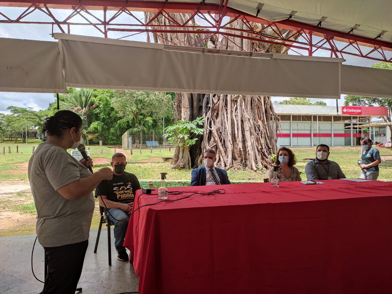 A gestão da UnB esteve na reunião, representada por Paulo Cesar (Chefe de Gabinete) e Rozana Reigota Naves (Decana de Administração), que em suas falas tranquilizaram todos afirmando que a Universidade não tem intenção de demitir ninguém.